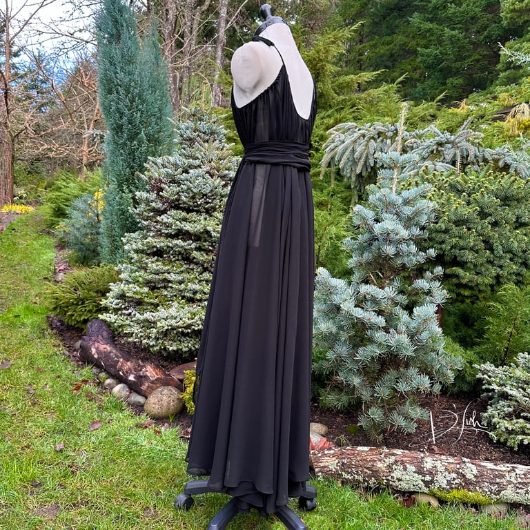 Gown is full-circle, with adjustable ties and added sash. Length from attached ties to hem is about 48"-50". (as a circle, some bias variation is normal.)