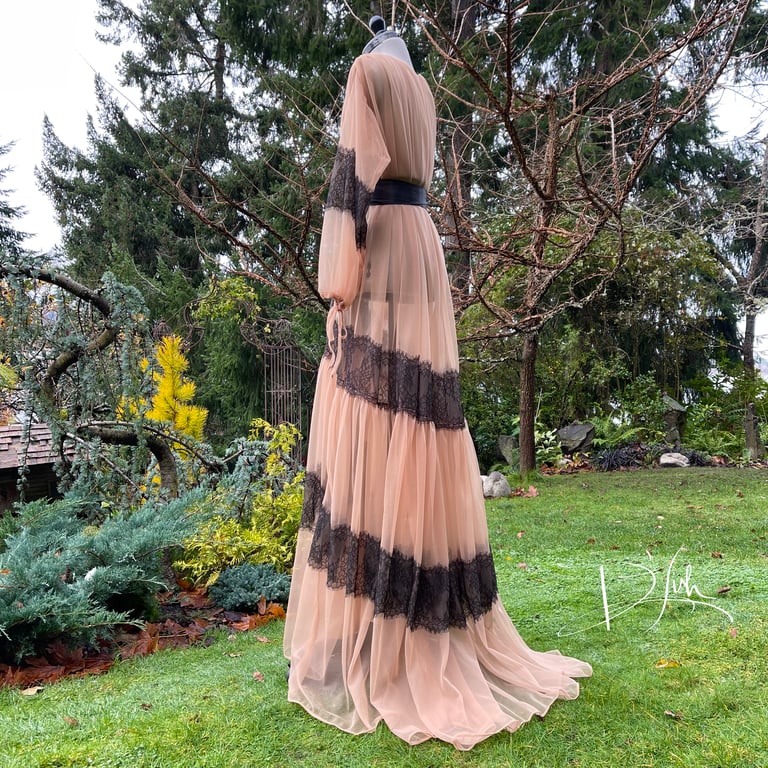 This gown is made with a sheer soft nylon chiffon, for a vintage look and feel. Sleeves, body, and gathered skirt are embellished with a soft delicate row of lace. It may be worn with or without the black satin sash. End of sleeves is gathered and secured with a same-fabric tie, and is adjustable.