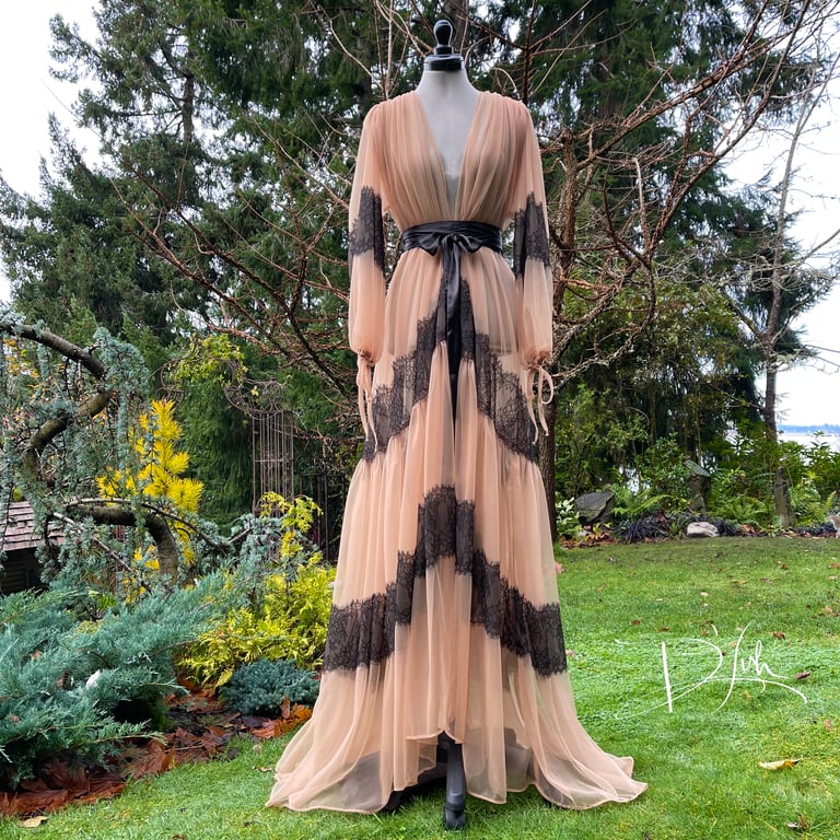 Black & Light Mocha "Elisabeth" Sheer Dressing Gown w/ Lace