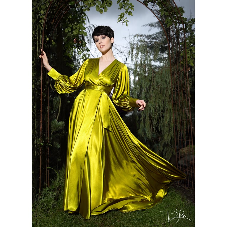 This dressing gown embodies pure extravagance with dramatic sleeves and fitted cuffs for a classic boudoir feel reminiscent of Hollywood’s golden era. The skirt is extremely full, and the three crystal buttons on each cuff perfectly enhance the luxuriousness of the fabric. The soft, sleek charmeuse drapes beautifully around the bodice, and nips in at the waist with a sexy sash. Pure decadence both inside and out, the gown is lined with the same delicious charmeuse on the inside, and the sensuously sweeping skirt is a full circle shape, ideal for impromptu dance numbers around the house! All this and pockets too!