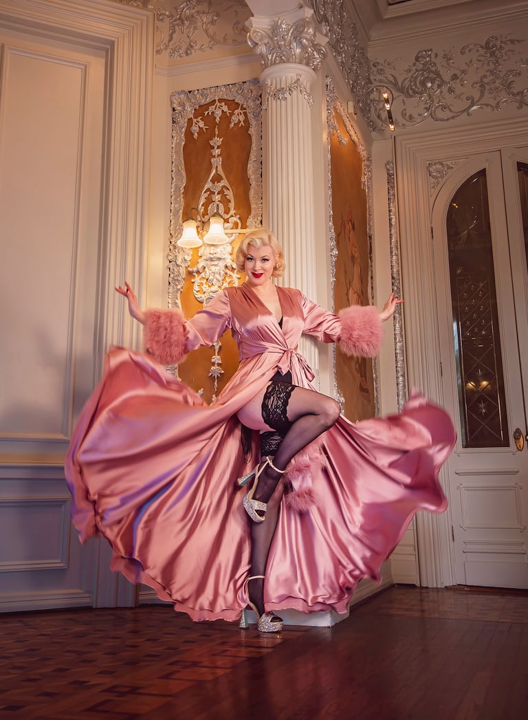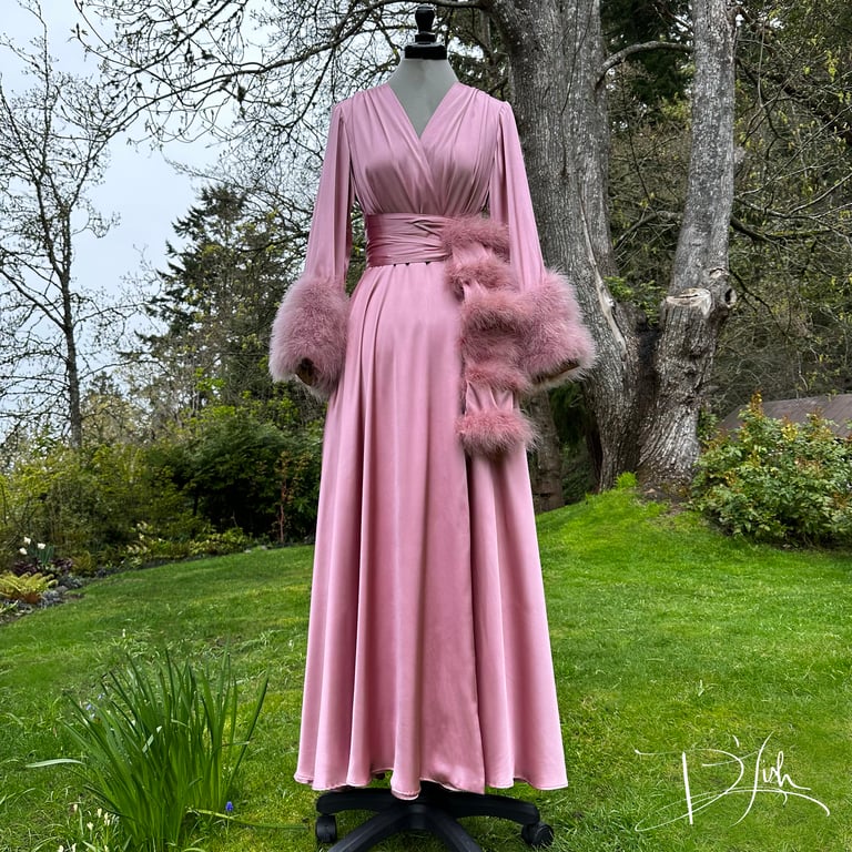 The gown embodies pure extravagance, featuring dramatic cuffs trimmed with plush marabou for a classic boudoir feel reminiscent of Hollywood’s golden era. The soft, sleek charmeuse drapes beautifully around the bodice, and nips in at the waist with a sexy sash, embellished with more marabou to add a glamorous touch. Pure luxury both inside and out, the gown is lined with the same delicious charmeuse on the inside, and the sensuously sweeping skirt is a full half-circle, ideal for impromptu dance numbers around the house. All this and pockets too!
