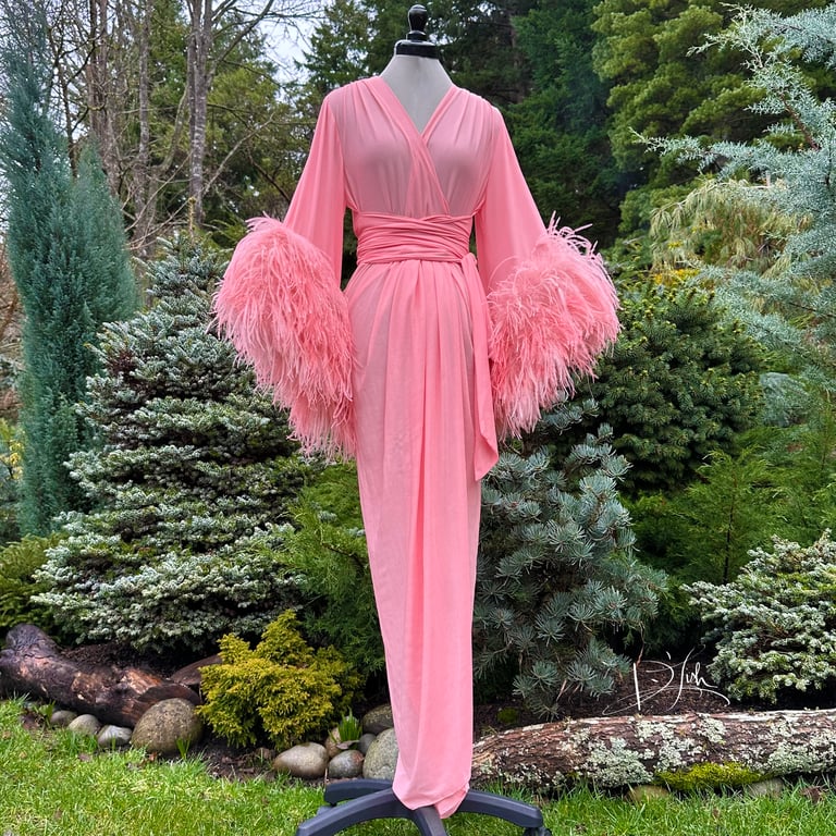 Slinky with a sensual feel, this soft sheer jersey will cling to your curves. An extravagant gown with luscious full ostrich sleeve. Wrap style, two snaps to secure, and waist is cinched with attached sash.