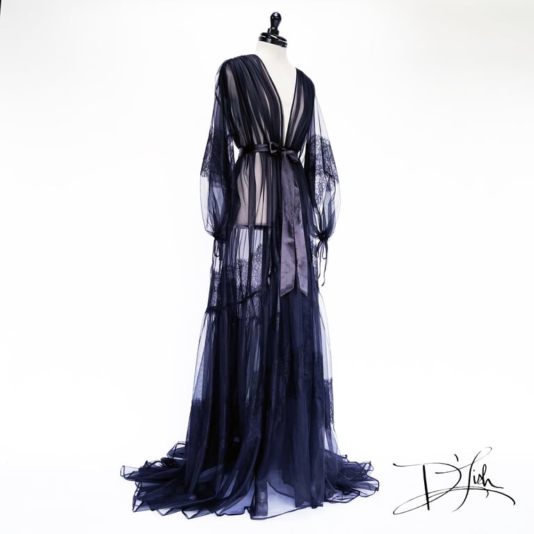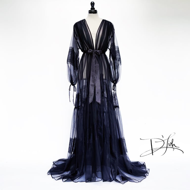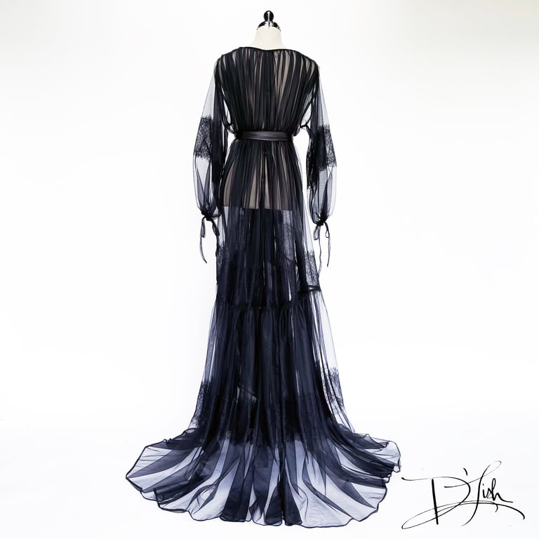 "Elisabeth" Sheer Dressing Gown w/ Lace, Black