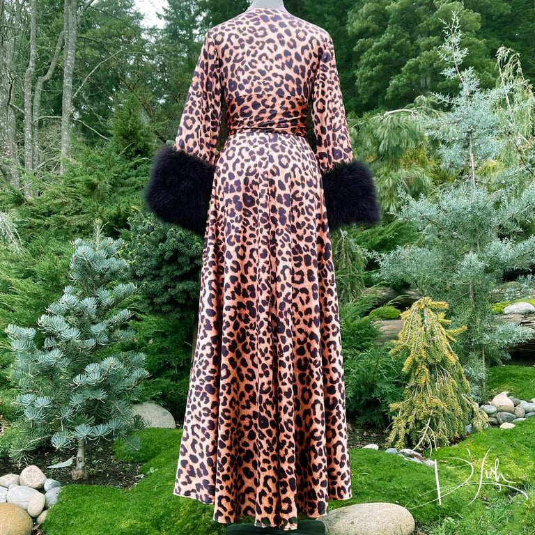 The Leopard Marabou-cuffed Beverly gown embodies pure extravagance, featuring dramatic cuffs trimmed with plush marabou for a classic boudoir feel reminiscent of Hollywood’s golden era. The soft, sleek charmeuse drapes beautifully around the bodice, and nips in at the waist with a sexy sash, embellished with more marabou to add a glamorous touch. Pure luxury both inside and out, the gown is lined with the same delicious charmeuse on the inside, and the sensuously sweeping skirt is a full half-circle, ideal for impromptu dance numbers around the house. All this and pockets too!