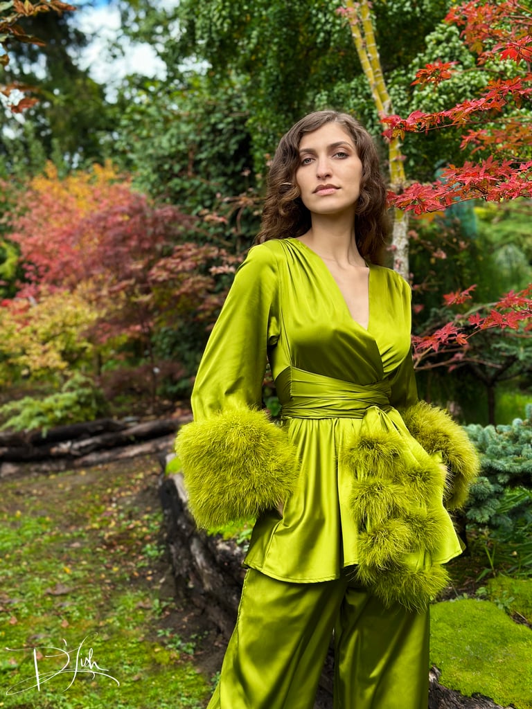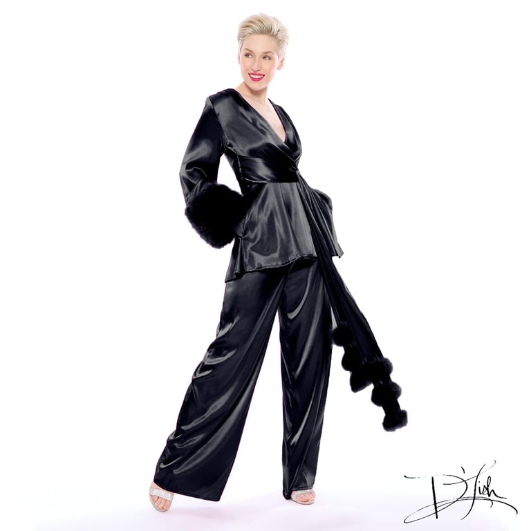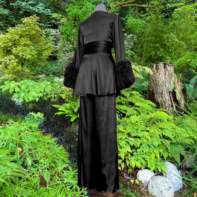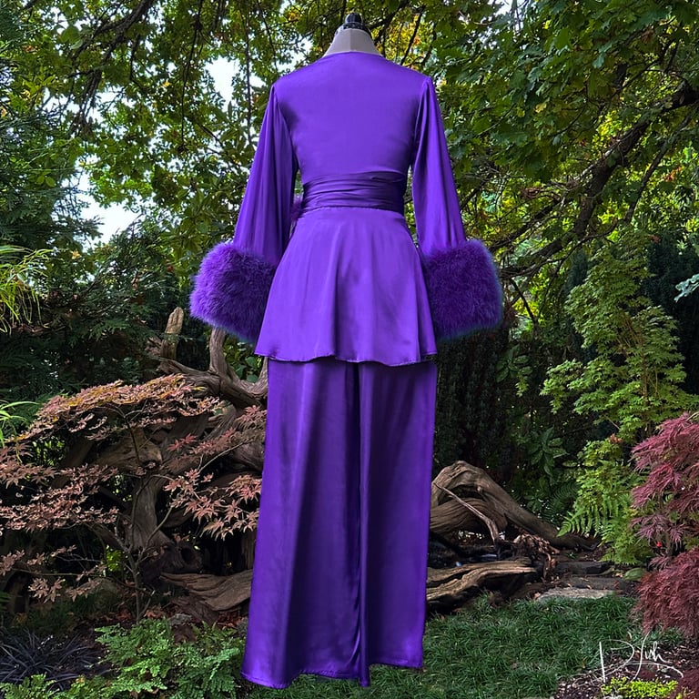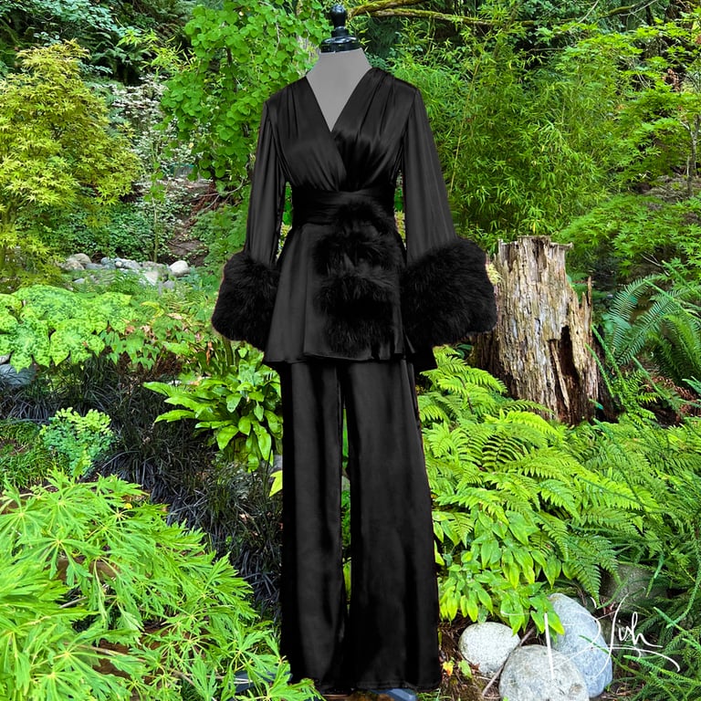 The soft, sleek charmeuse drapes beautifully around the bodice, and nips in at the waist with a sexy sash. Pure decadence both inside and out, the jacket is lined with the same delicious charmeuse on the inside. The full palazzo pants slip on (and off) with an elastic waist. They are light and breezy with plenty of room to sprawl to your hearts content. All this and pockets too!