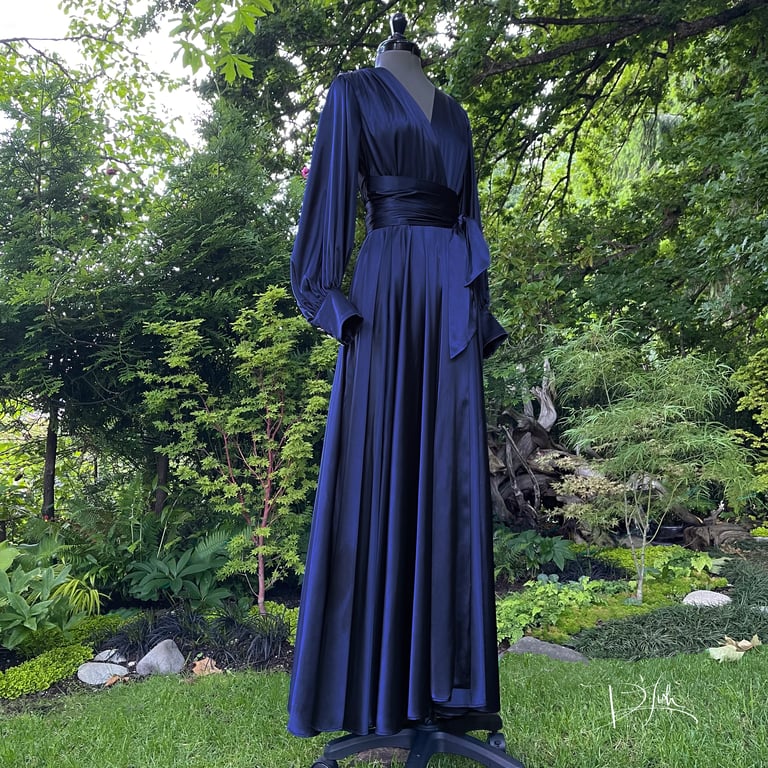 Midnight Blue "Beverly" Dressing Gown w/ Crystal Button Cuffs PRE-ORDER FOR NOVEMBER