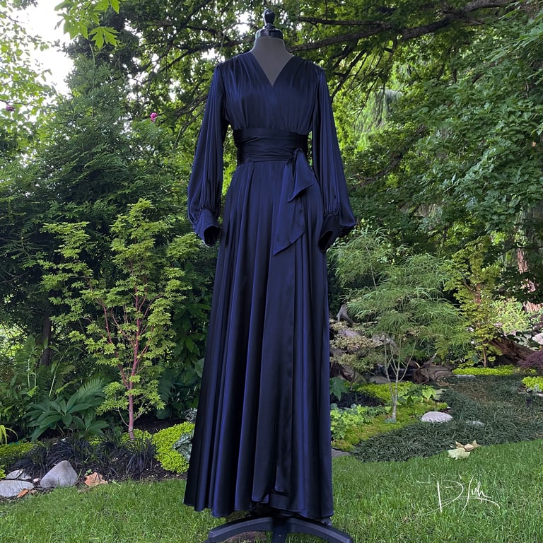 This dressing gown embodies pure extravagance with dramatic sleeves and fitted cuffs for a classic boudoir feel reminiscent of Hollywood’s golden era. The skirt is extremely full, and the three large crystal buttons on each cuff perfectly enhance the luxuriousness of the fabric. The soft, sleek charmeuse drapes beautifully around the bodice, and nips in at the waist with a sexy sash. Pure decadence both inside and out, the gown is lined with the same delicious charmeuse on the inside, and the sensuously sweeping skirt is a full circle shape, ideal for impromptu dance numbers around the house! All this and pockets too!