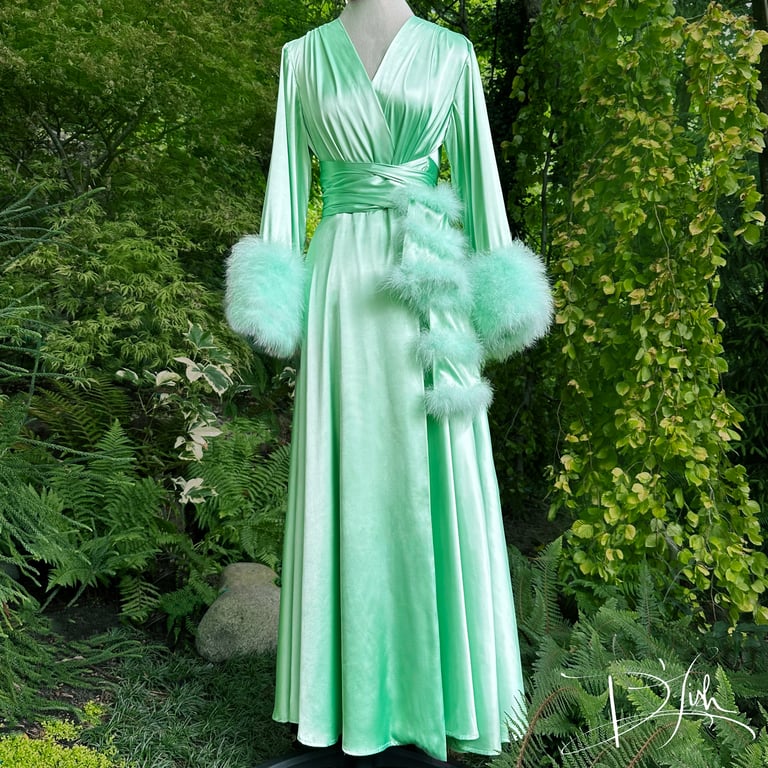 The gown embodies pure extravagance, featuring dramatic cuffs trimmed with plush marabou for a classic boudoir feel reminiscent of Hollywood’s golden era. The soft, sleek charmeuse drapes beautifully around the bodice, and nips in at the waist with a sexy sash, embellished with more marabou to add a glamorous touch. Pure luxury both inside and out, the gown is lined with the same delicious charmeuse on the inside, and the sensuously sweeping skirt is a full half-circle, ideal for impromptu dance numbers around the house. All this and pockets too!