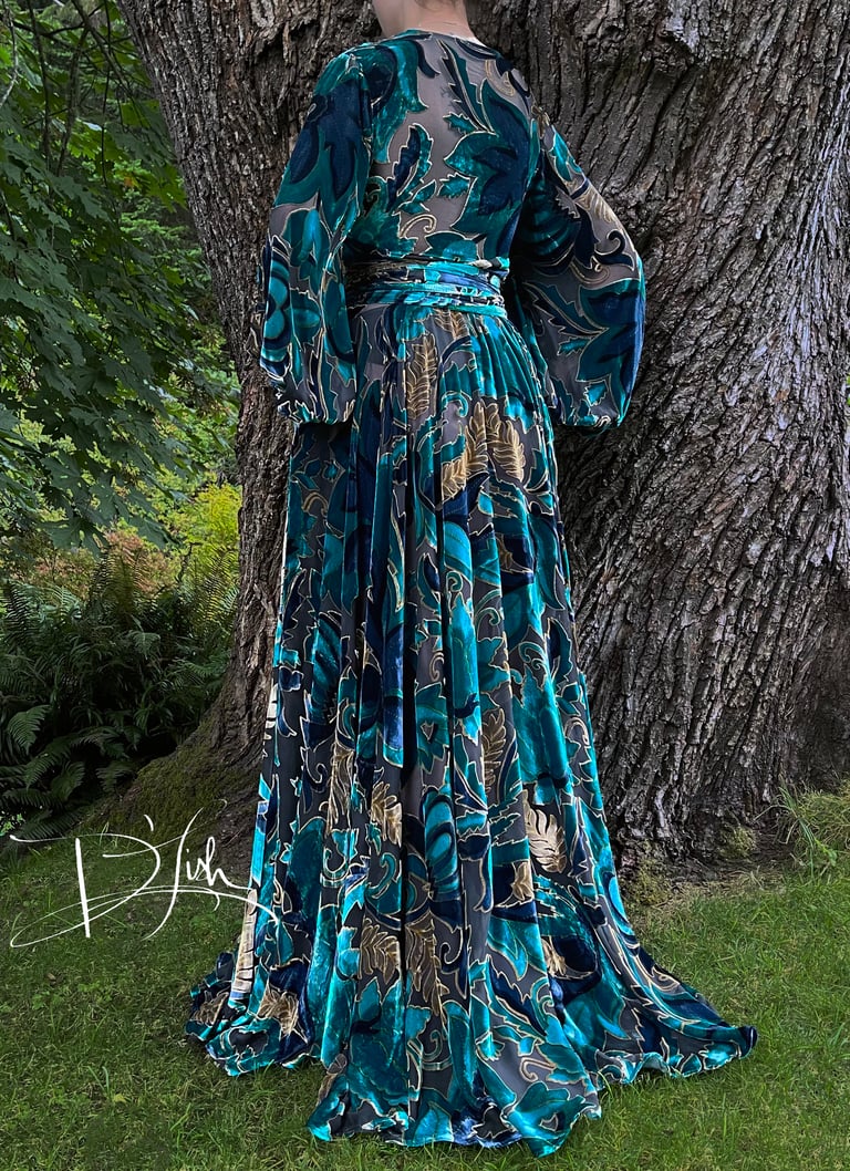 This dressing gown embodies pure extravagance with dramatic sleeves and fitted cuffs for a classic boudoir feel reminiscent of Hollywood’s golden era. The skirt is extremely full, and the three large crystal buttons on each cuff perfectly enhance the luxuriousness of the fabric. The sheer teal mix silk burnout velvet drapes beautifully around the bodice, and nips in at the waist with a sexy sash. Pure decadence, and the sensuously sweeping skirt is a full circle shape, ideal for impromptu dance numbers around the house! All this and pockets too!