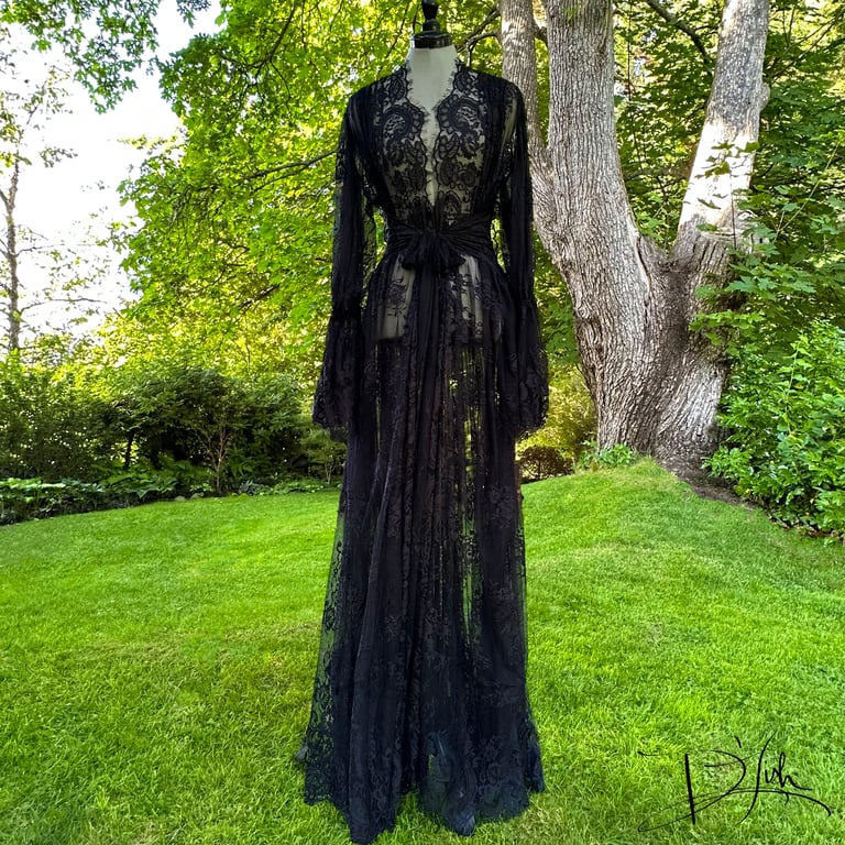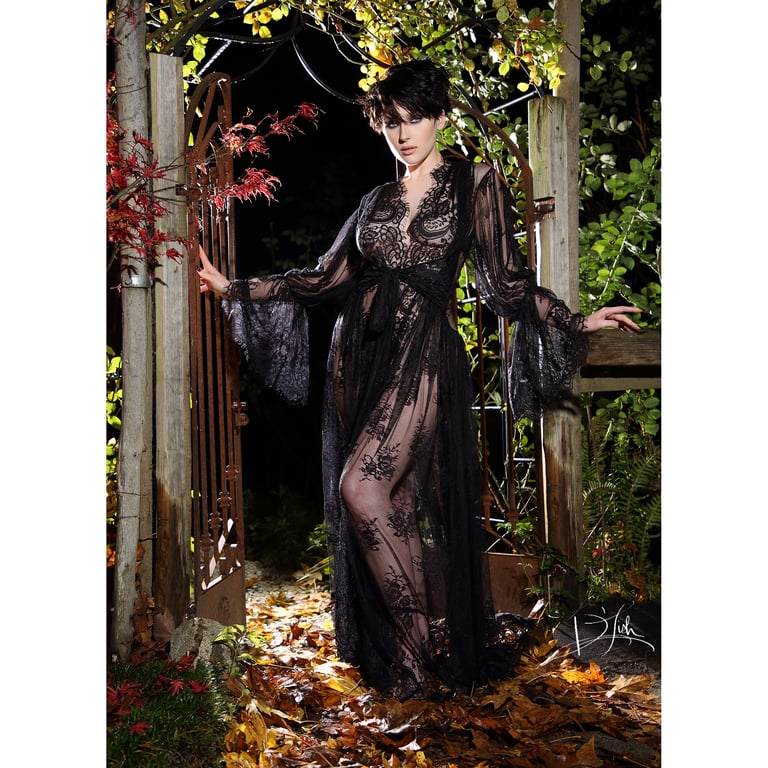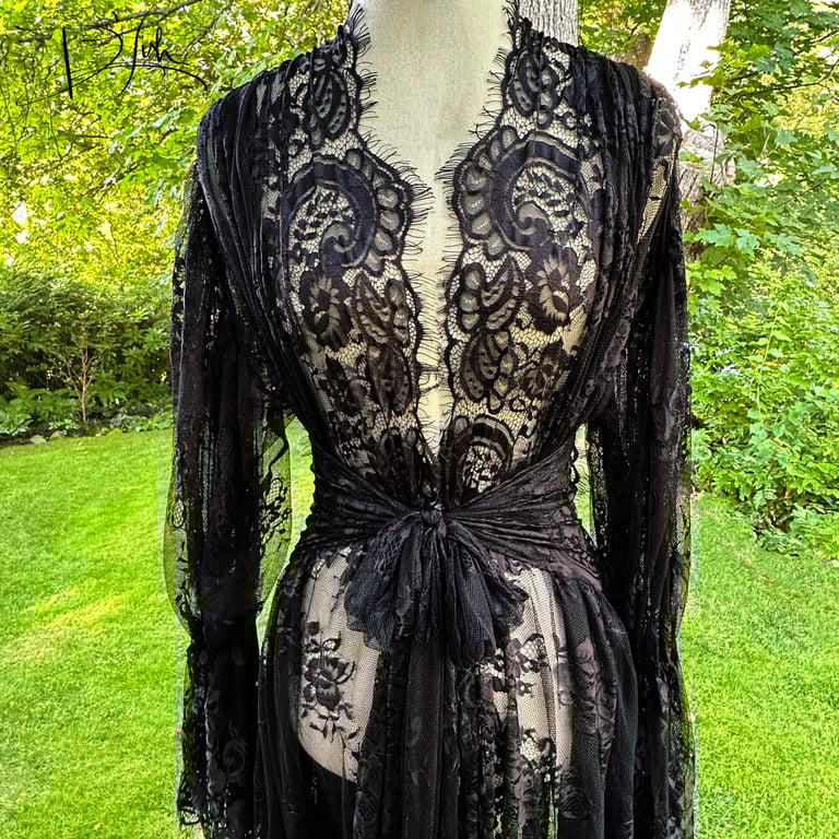 Our "Valentina" lace dressing gown is made with soft lace, with an extended sheer back bodice to showcase your curves. Attached sash is set into the sides to further accentuate the lovely lines of your torso. Sleeves are gently gathered around the mid-arm, with a free-flowing feminine cuff. The lace in the front can be gathered to the sides for a more daring look, or easily adjusted for more demure coverage. There's plenty of lace in front to either wrap or display the cleavage of your spectacular bosom, while the low back will highlight your "other cleavage".